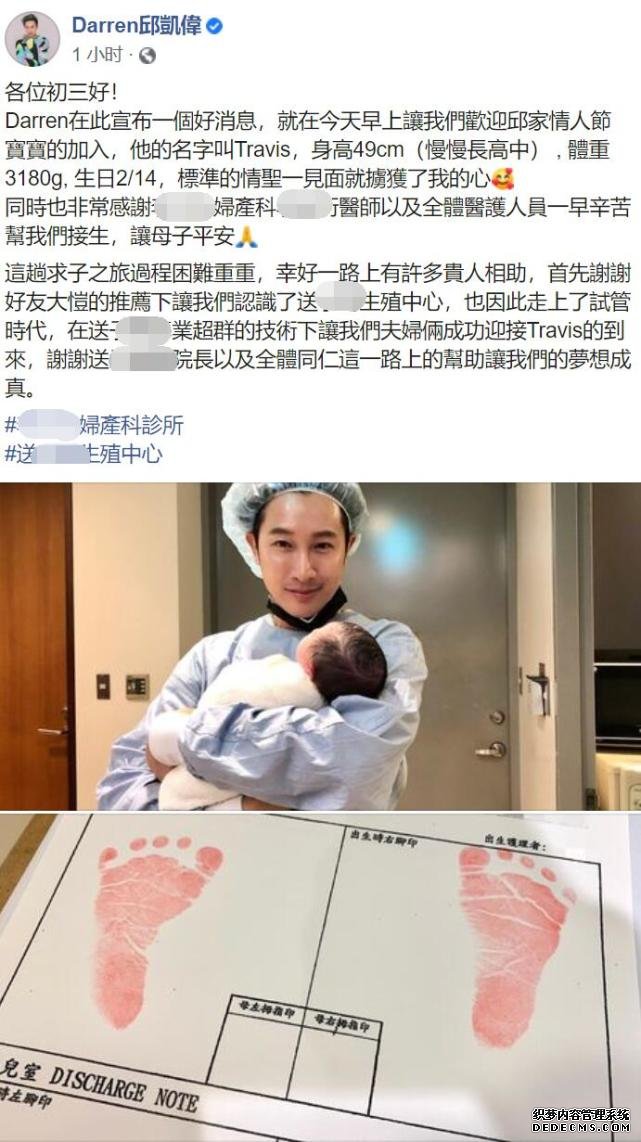 歷經了漫漫5年的求子之路后,邱凱偉和Vivi終于如愿以償,令人感慨,兩人對著媒體開心釋懷稱Travis的到來是他們彼此收到的最特別又最有意義的“情人節禮物”。