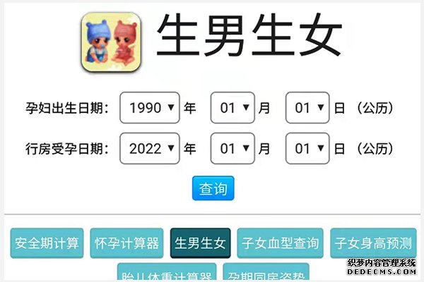 女性懷孕后總想預測胎兒性別,想提前知曉是男孩還是女孩,在網絡上有在線免費算生男生女計算器,只需要輸入孕婦出生日期、同房受孕日期后,系統會自動計算出孕婦的虛歲和農歷月份,然后通過與清宮圖生男生女表等進行信息比對,得出生男孩還是生女孩的預測結果,其結果數據并不能保證真實性,僅供參考而已。