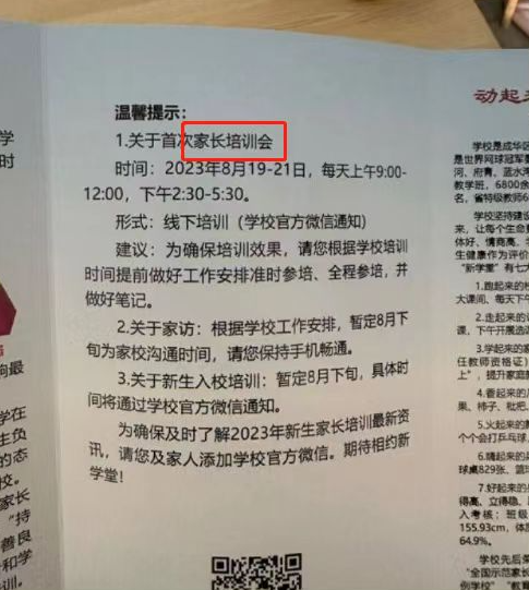 網傳圖片顯示,此次家長會是該校2023年新生家長首次培訓會,時間是2023年8月19日-21日,每天上午9點-12點,下午2點30分-5點30分,形式為線下培訓。同時,學校建議,為確保培訓效果,請家長根據學校培訓時間提前做好工作安排準時參培、全程參培,并做好筆記。
