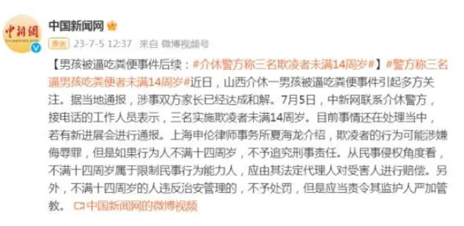 7月5日,介休警方工作人員表示,三名實施欺凌者未滿14周歲。目前事情還在處理當中,若有新進展會進行通報。