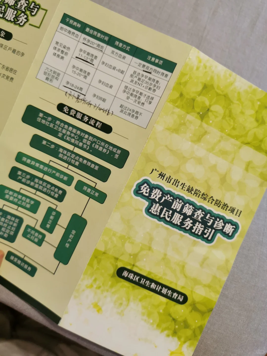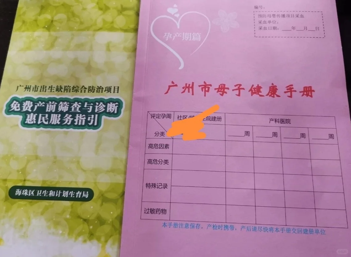 a.填寫信息時(shí),會(huì)詢問你未來產(chǎn)檢生孩子的醫(yī)院,如海珠區(qū),有幾個(gè)指定醫(yī)院可以選,在指定醫(yī)院里可以進(jìn)行免費(fèi)NT檢查、夫妻雙方地貧、二維彩超(如果要4維到時(shí)在醫(yī)院那邊加錢升級(jí)就好)。免費(fèi)篩查券不是實(shí)體的物,但社區(qū)醫(yī)院辦理后會(huì)給你一張“綠色的指引單”(叫做免費(fèi)產(chǎn)前篩查與診斷惠民服務(wù)指引,它很重要,到時(shí)候去指定醫(yī)院是要拿著它去確認(rèn)的。)和一本粉紅色的《母子健康手冊(cè)》。