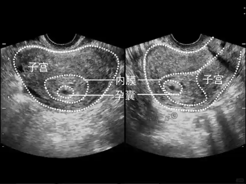 5??羊膜:早孕期羊膜囊菲薄,超聲常不能顯示。孕7周以后加大增益或者用高頻超聲可以顯示羊膜。羊膜囊位于絨毛膜內(nèi),胚胎位于羊膜囊內(nèi)。隨著胚胎增長(zhǎng),羊水增多,羊膜囊增大,孕12-16周時(shí),羊膜與絨毛膜全部融合,胚外體腔消失。宮腔線(xiàn)一側(cè)內(nèi)膜內(nèi)一圓形增強(qiáng)回聲區(qū),中央有小囊狀液性暗區(qū),宮腔線(xiàn)局部突起變形,稱(chēng)蛻膜內(nèi)征,用于判斷早早孕。#超聲 #早孕檢查 #妊娠